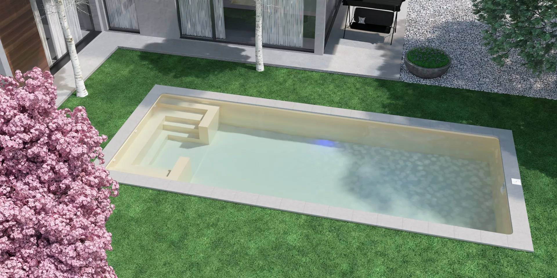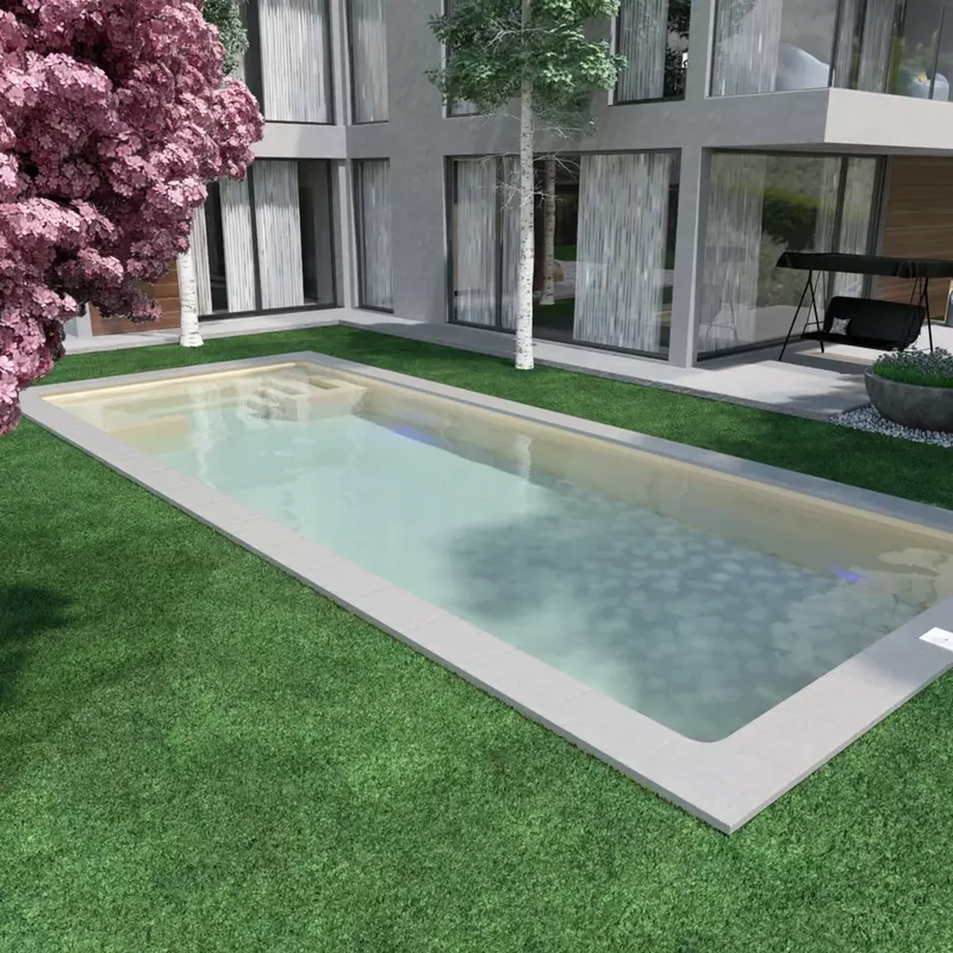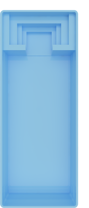 El diseño incorpora escalones de acceso amplios y cómodos que garantizan una entrada segura y progresiva. Gracias a sus dimensiones, permite una distribución equilibrada entre las zonas de uso, optimizando la funcionalidad del vaso. Una solución versátil y atractiva para profesionales que desean ofrecer un producto de alto valor añadido y gran impacto estético.
