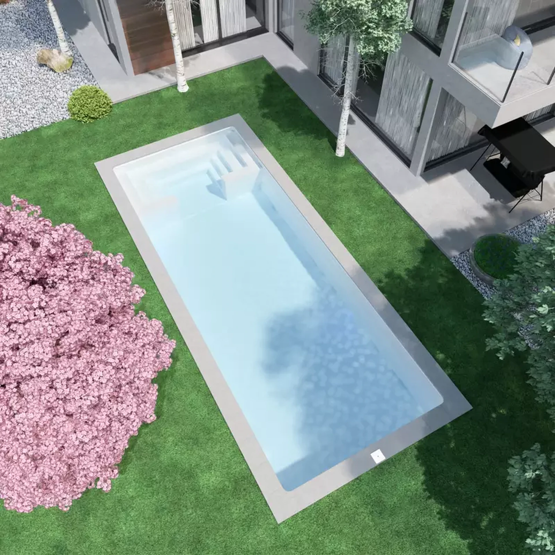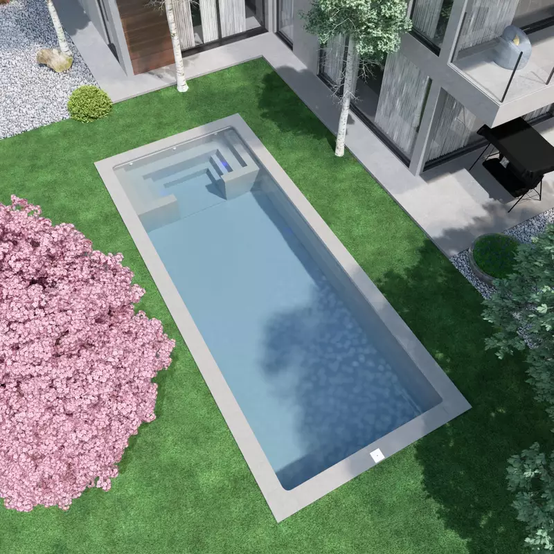 La L1050 es una piscina 10.5x4 de gran formato diseñada para ofrecer una experiencia completa de confort y bienestar en proyectos residenciales exigentes. Su amplio espacio de nado se combina con una generosa zona de relax integrada, pensada para disfrutar del agua de forma más tranquila y social. Este espacio tipo lounge aporta un valor añadido diferencial, ideal para clientes que buscan algo más que una piscina convencional.